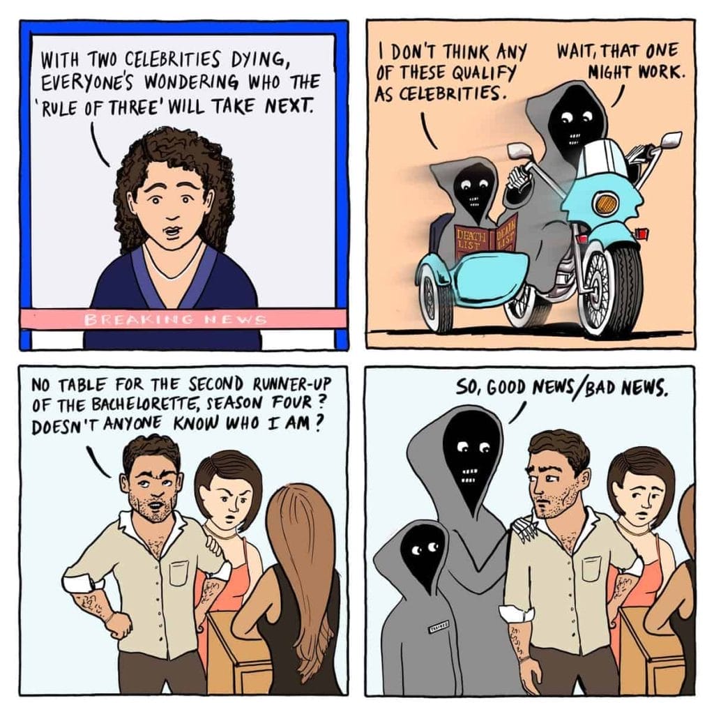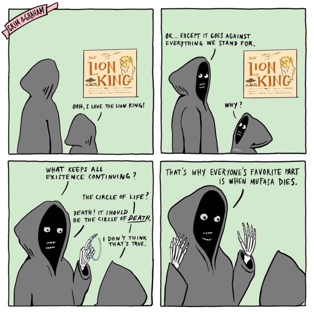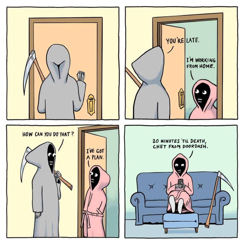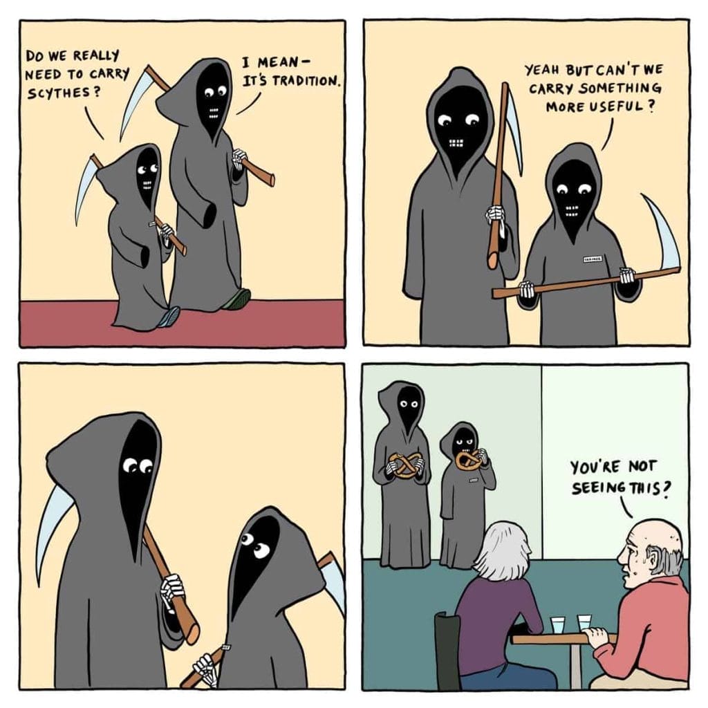 Grim and Graham Comics is an Instagram artist duo known for their four-panel comic strips featuring Grim and Graham Reaper. The comics are humorous and often depict everyday situations with a twist. The artist behind Grim and Graham Comics is Graham Millar, who began self-publishing in February 2020 with his first mini-comic, “Mozzarella: A Rumble in the Jungle”. Grim, the older of the duo, is tall, slender, and wears the traditional black cloak and hood that we all associate with the grim reaper.