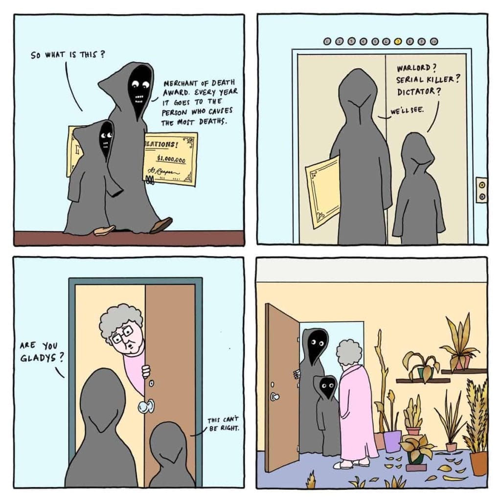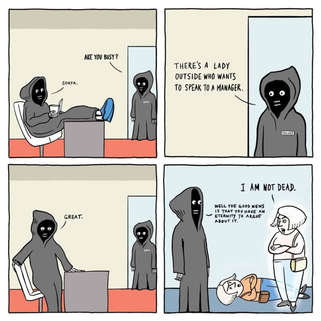 Grim and Graham Comics is an Instagram artist duo known for their four-panel comic strips featuring Grim and Graham Reaper. The comics are humorous and often depict everyday situations with a twist. The artist behind Grim and Graham Comics is Graham Millar, who began self-publishing in February 2020 with his first mini-comic, “Mozzarella: A Rumble in the Jungle”. Grim, the older of the duo, is tall, slender, and wears the traditional black cloak and hood that we all associate with the grim reaper.