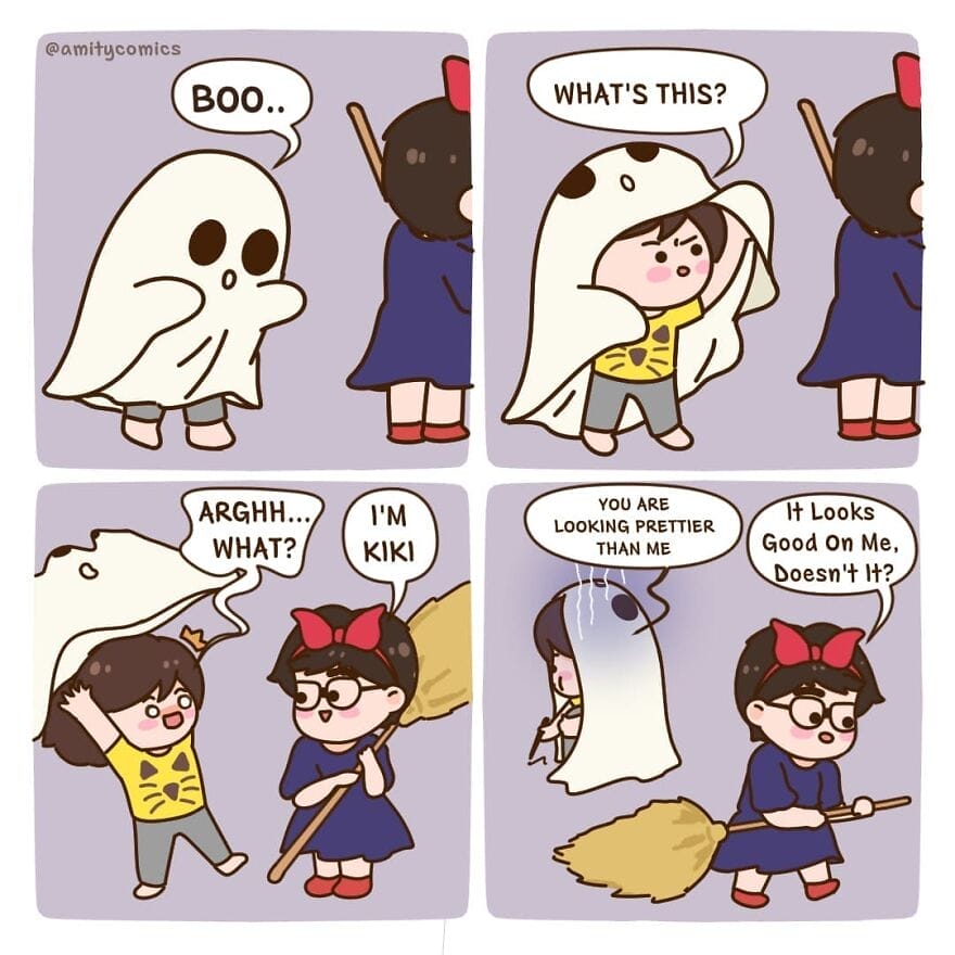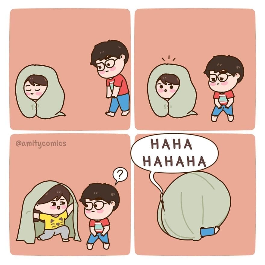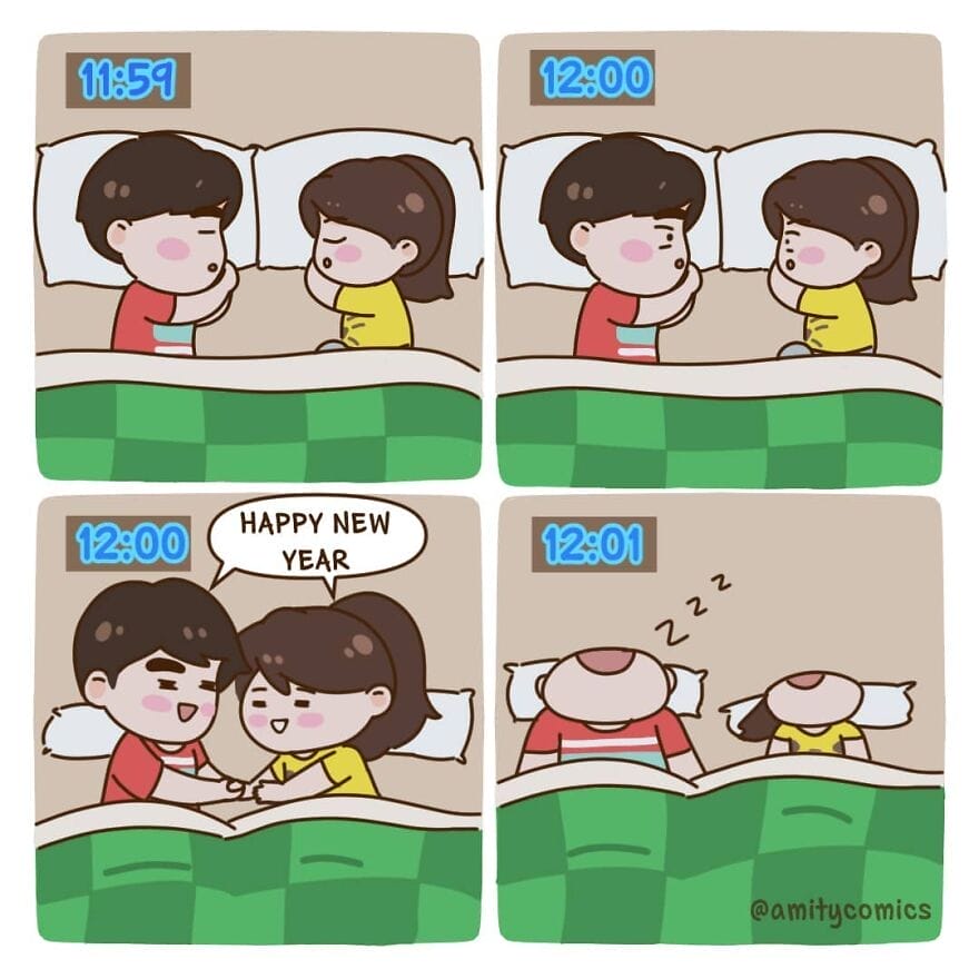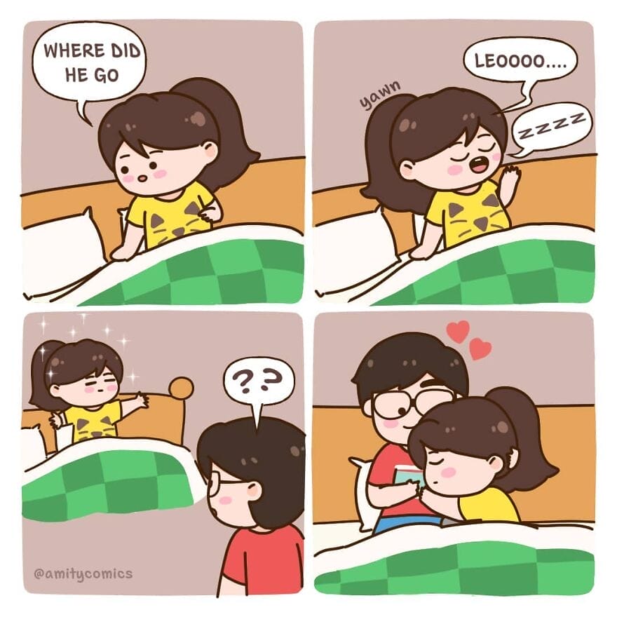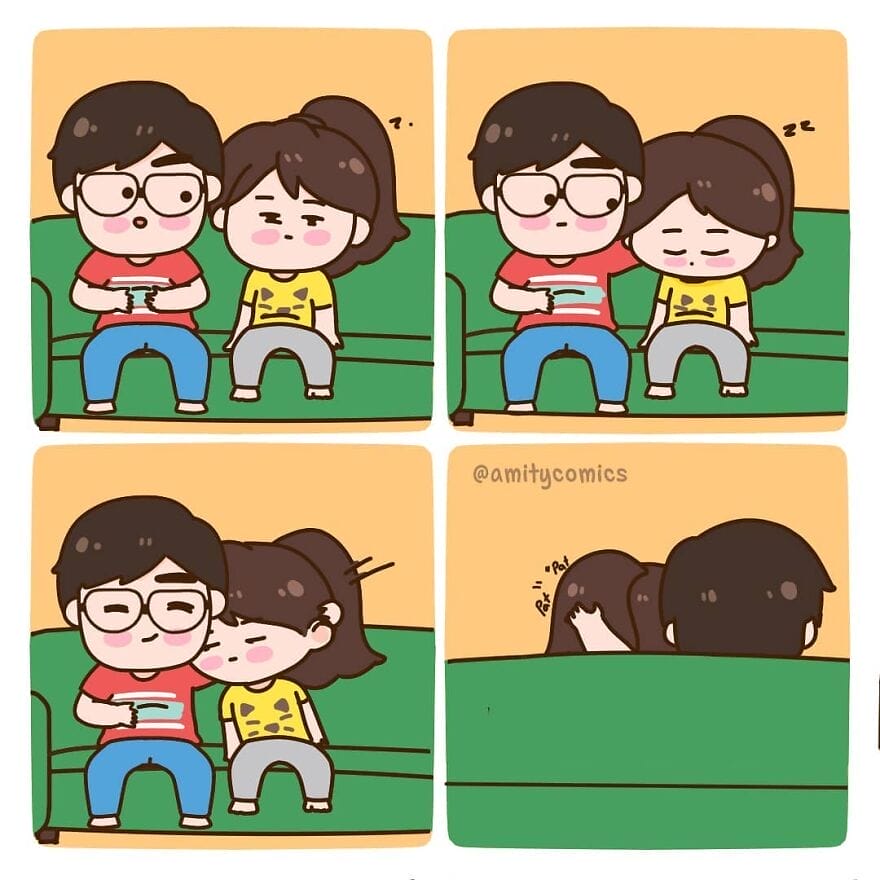 Amity Comics’ comics often feature the couple going on adventures together, spending time with their friends and family, and navigating the everyday challenges of being in a relationship. The humor is often self-deprecating and relatable, and the characters are quirky and endearing. They are best known for their wholesome and relatable content. Their comics often depict scenarios that many can empathize with, offering a lighthearted yet honest portrayal of the ups and downs that come with sharing your life with someone else. Let’s take a look at some of her best illustrations.
