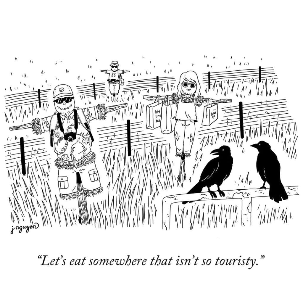When tourists blend into scarecrows, it’s a witty comment on overcrowding and the way we see travelers everywhere.