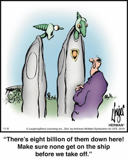Two aliens stare at Earth’s eight billion humans and agree: don’t let any of them on the ship. Can’t blame them.