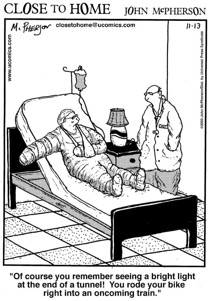 A bandaged patient remembers a tunnel of light. The doctor’s explanation? He biked into a moving train. Harsh truths hurt, but McPherson makes them hilarious.