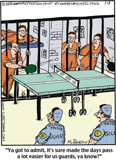 Prison guards are thrilled that the inmates now have ping pong in their cells. A darkly funny reminder that not all rehabilitation programs go as planned. The visual of inmates playing through the bars is priceless.