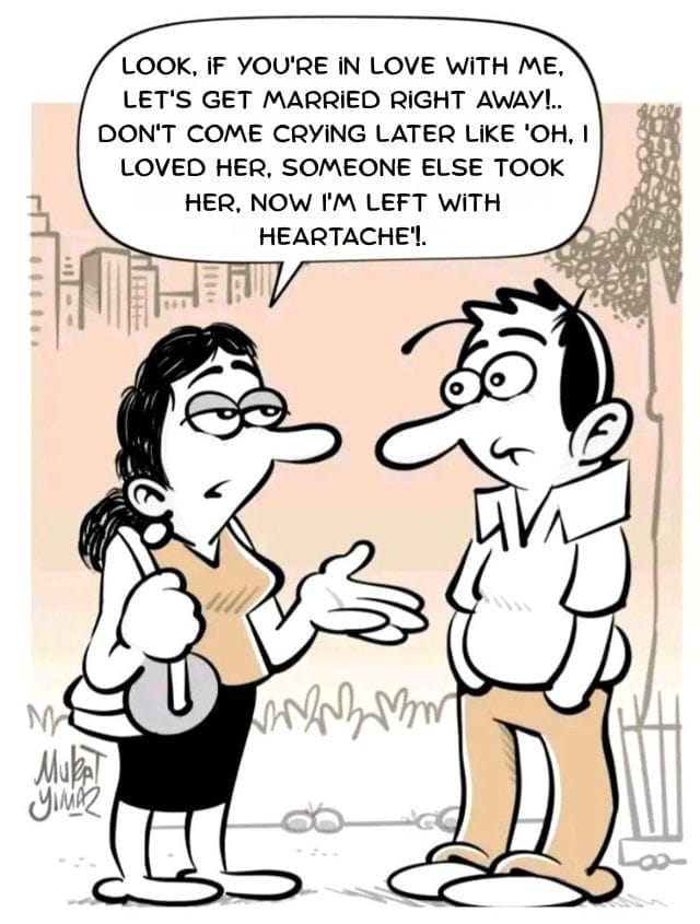 A bold woman lays it down straight: “If you’re in love, marry me now — don’t cry later when someone else does!” It’s aggressive, honest, and kind of genius. This comic flips the script on romantic hesitation with humor and urgency.