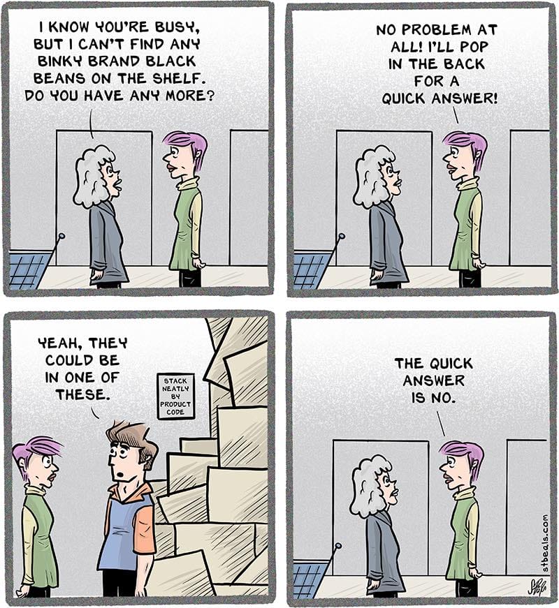A customer asks for a simple stock check, and the journey to the back room reveals nothing but towering boxes. The final answer? “No.” This one’s for everyone who’s ever had to fake productivity while secretly giving up inside.