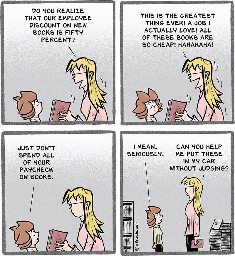 Half-off books? A blessing and a curse. This comic turns book addiction into a workplace hazard and the ending (“Help me put these in my car without judging”) is both hilarious and painfully accurate.