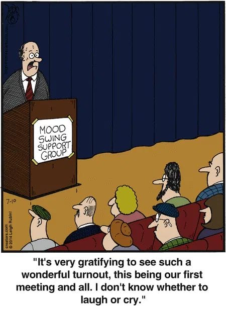 The leader of the “Mood Swing Support Group” can’t decide whether to laugh or cry at the turnout. Cartoon therapy for anyone who’s ever felt both… at the same time.
