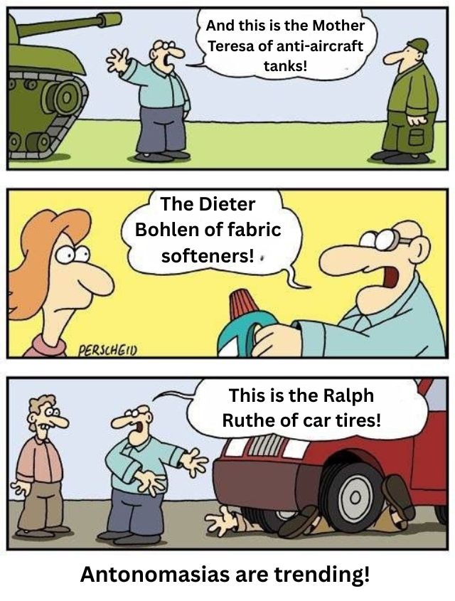 This comic gives us Mother Teresa tanks and Dieter Bohlen detergent. It’s absurd, name-droppy, and delightfully nonsensical.
