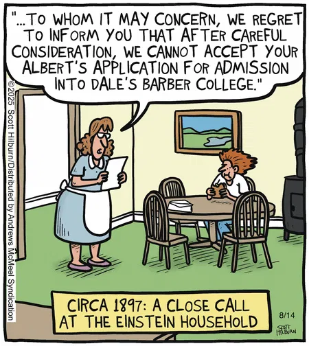 Even geniuses get rejection letters. Absurd humor at its best: Albert’s legendary hair almost ruined his barber college dreams.
