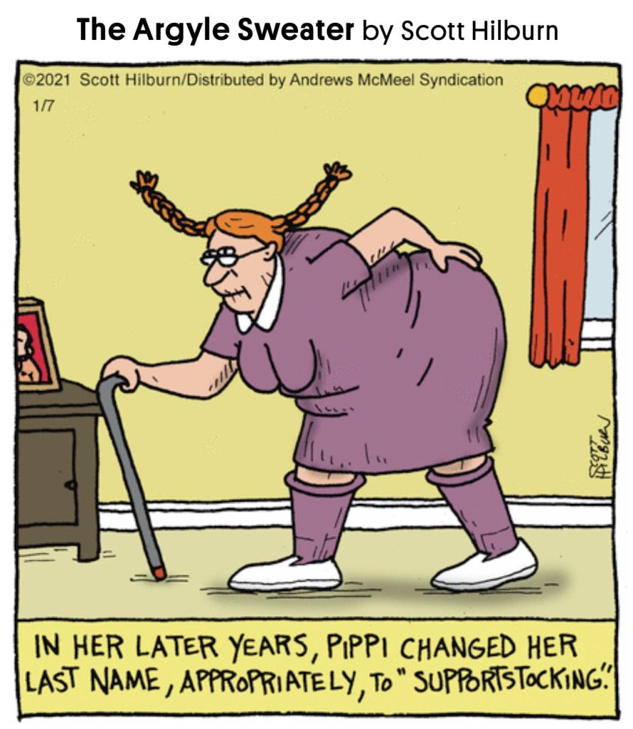 Aging absurdity strikes again. Pippi grows old and turns into Supportstocking—a pun with extra elastic snap.