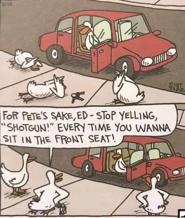This gag quacks with brilliance. Ducks fighting over front seats by literally calling “shotgun” takes the phrase to hilarious extremes.