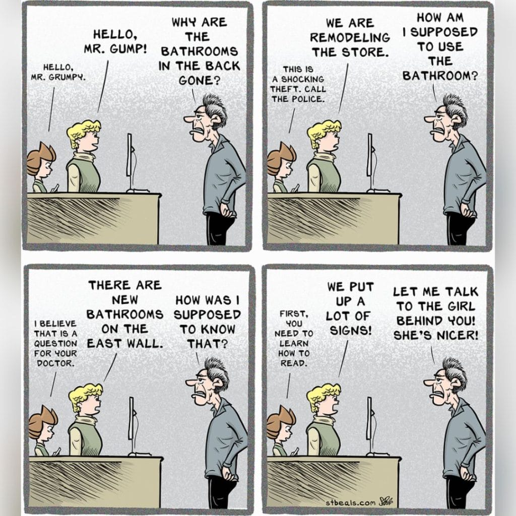 One of Beals’ most laugh-out-loud examples of how logic is no match for real customers. The fourth panel brings it home—when empathy leads to brutal honesty (“You’re feeling crazy because we’re annoying”), you know the training manual just got shredded.