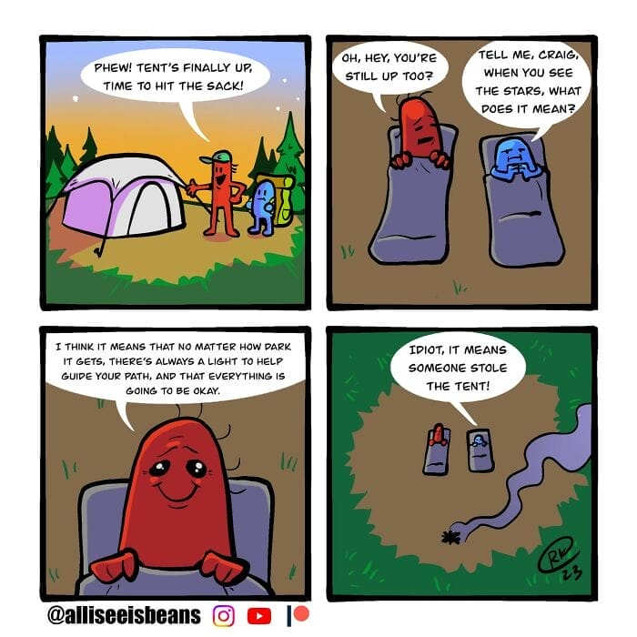 If you’re a fan of dark humor, we’ve got something special for you. Introducing All I See Is Beans a hilarious comic series created by the talented duo, Tyler and Ryan. Their work blends quirky characters absurd situations and a perfect dose of dark comedy. If you enjoy humor with a little edge, you’re in the right place. Get ready to dive into a collection of comics that are bound to make you chuckle and maybe even cringe. Keep scrolling to check out the strips we’ve handpicked for you today, and learn more about the creative minds behind these one-of-a-kind comics.