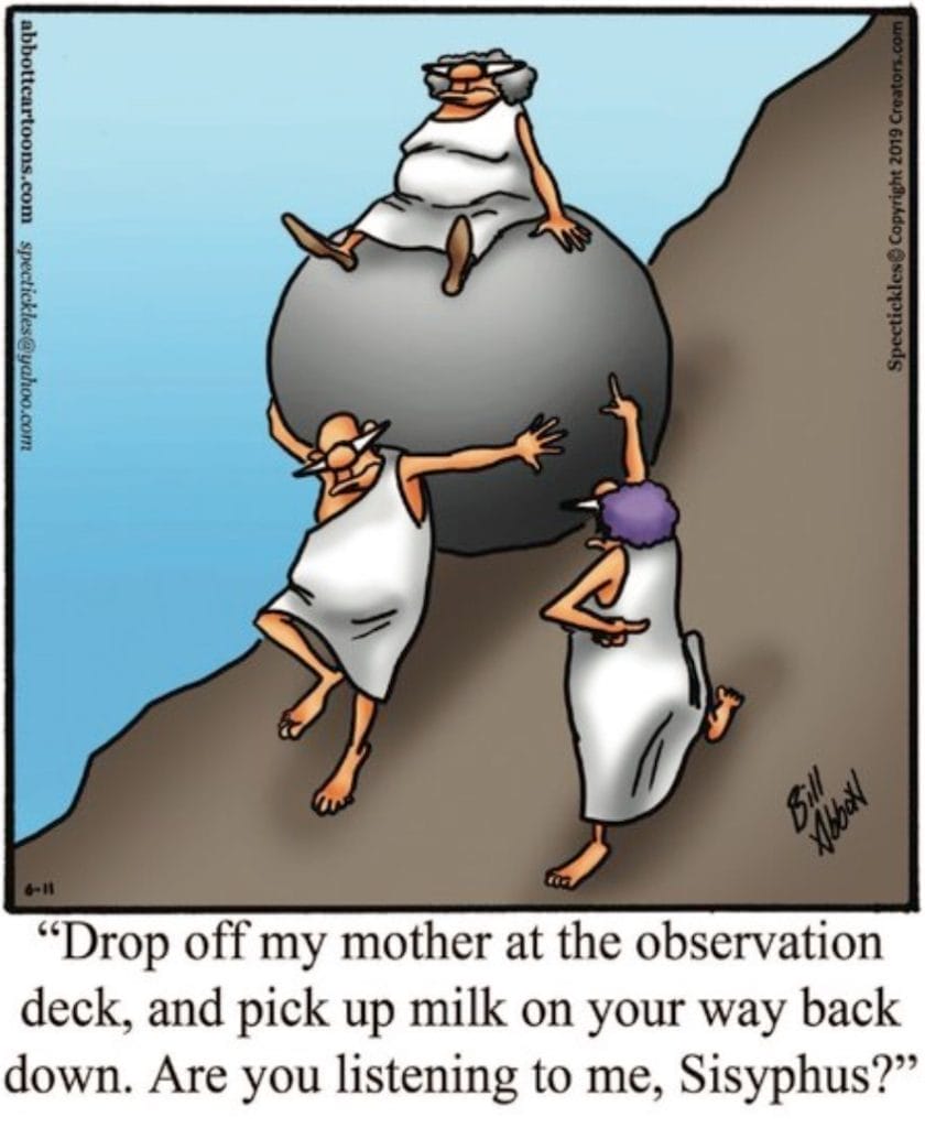 Sisyphus gets a honey-do list mid-boulder roll. Abbott turns a tragic Greek myth into a scene from a sitcom. Genius.