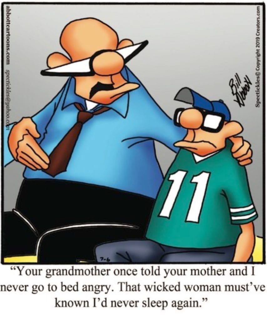 The classic advice to “never go to bed angry” gets the Abbott treatment. It’s heartfelt advice twisted with sarcastic genius.