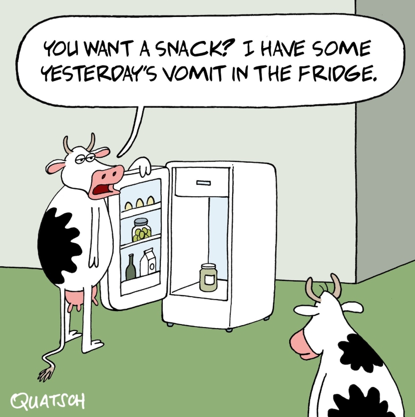 The idea of a snack being “yesterday’s vomit” is gross — but from a cow? It’s disturbingly funny. The blank stares only add to the hilarity of this cartoon’s gross-out appeal.