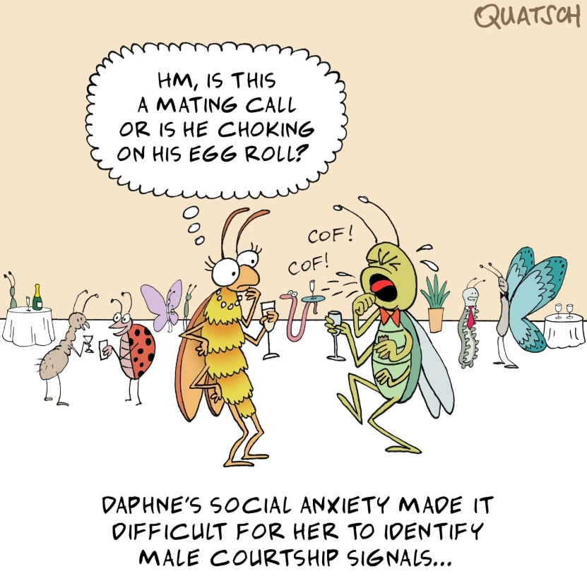 Buggy romance is complicated. Daphne’s date might be courting her — or choking on an egg roll. Either way, this cartoon gets laughs for social anxiety and insect innuendo.