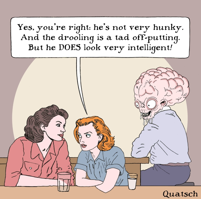Back at the retro diner, Carol’s friend is dating an alien with exposed brain matter. He may be drooling, but hey — he does look intelligent. This panel is brains-over-beauty, literally.