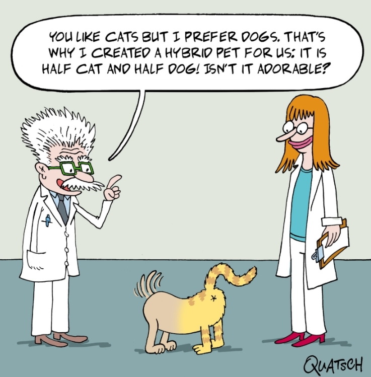 What do you get when you mix a dog with a cat? This unsettling hybrid. Bonus points for the mad scientist’s logic and the woman’s “adorable” reaction to the creature from pet hell.