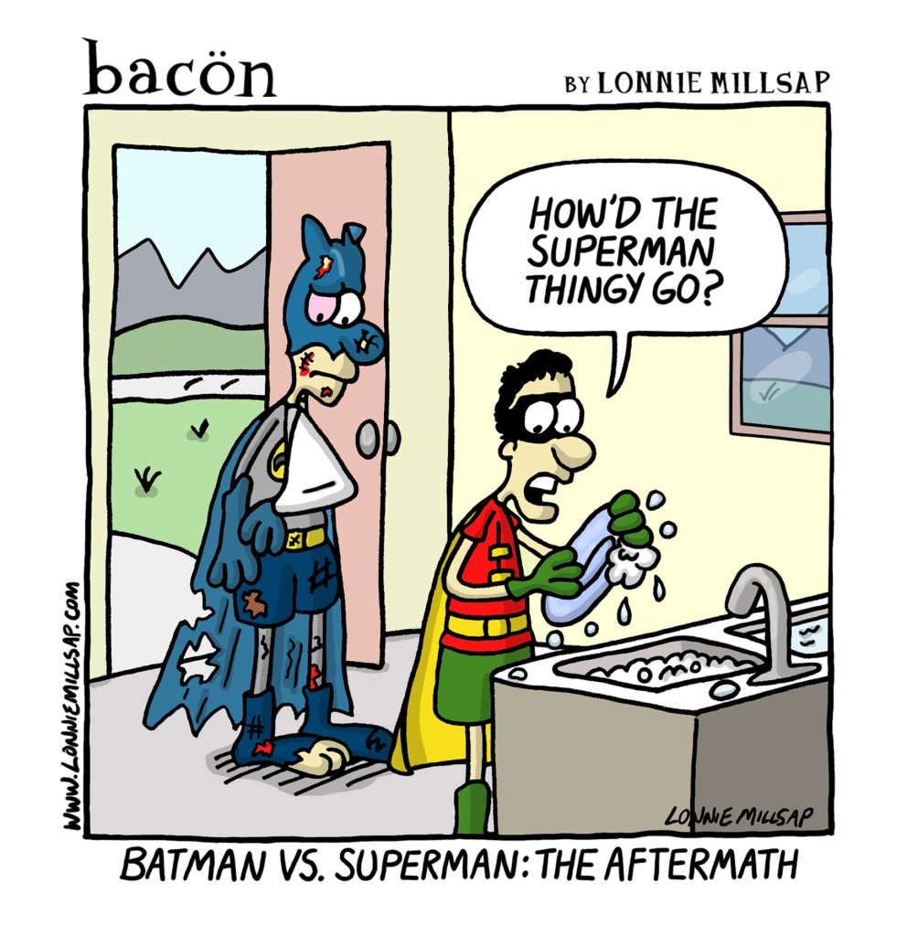 Superhero fatigue meets physical fatigue. A bedraggled Batman drags his bruised body into the house while Robin nonchalantly asks, “How’d the Superman thingy go?” Spoiler: not great. The cartoon nails what fans and critics have joked about for years—this epic battle might just be a bad idea. Or at least, bad for Batman.
