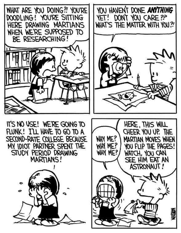 Instead of researching, Calvin spends the whole period drawing Martians, driving Susie to the brink. But hey, at least his flipbook animation has astronaut-eating aliens.
