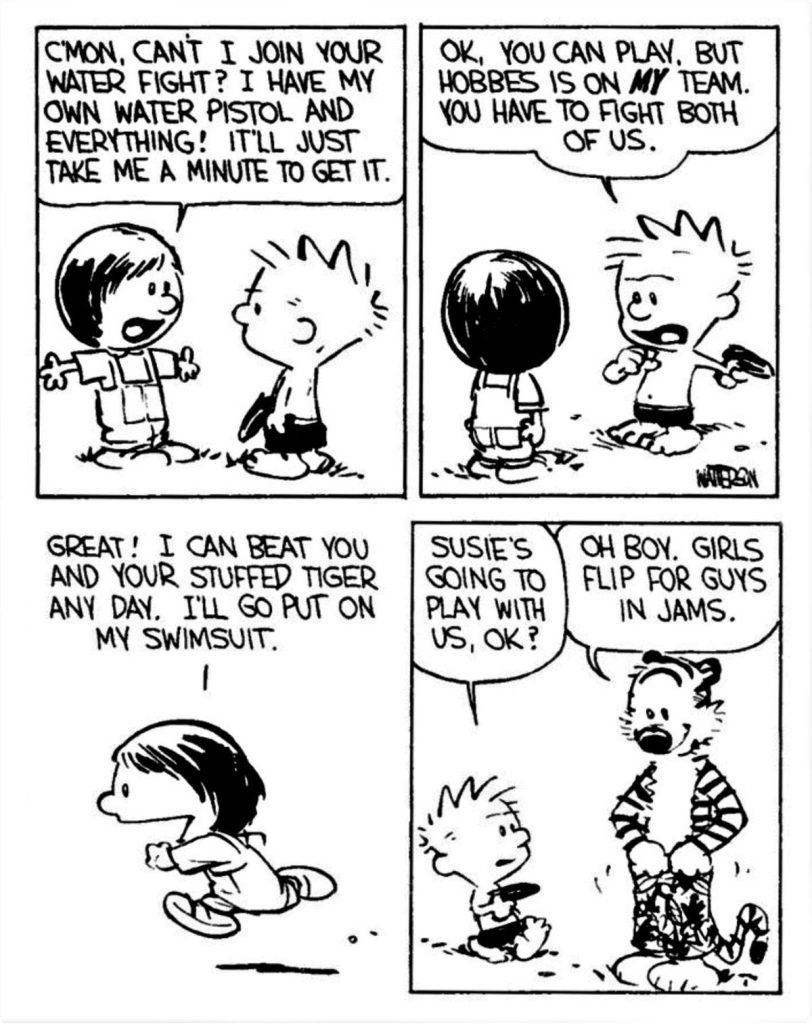 Susie wants in on Calvin’s water fight, but Hobbes is always on Calvin’s team. Susie doesn’t care—she’s ready to battle both of them. Game on.