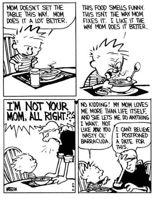Dinner’s not the same when it isn’t made by Mom. Calvin launches into a tirade about culinary standards—leaving the poor babysitter wondering why she agreed to this.