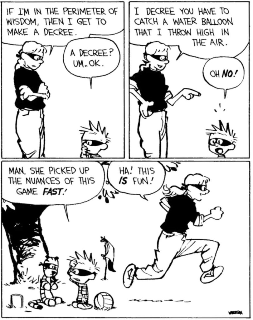 The “perimeter of wisdom” is a game Calvin can’t win, especially when Mom’s decrees involve catching water balloons. She catches on quick—and maybe enjoys it a bit too much.