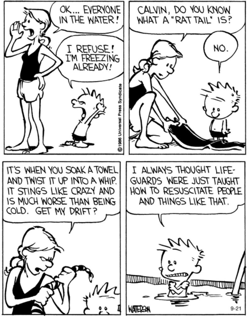 Calvin learns the true meaning of a “rat tail” at the pool—and wishes he hadn’t. Lifeguard skills, as it turns out, go way beyond CPR.