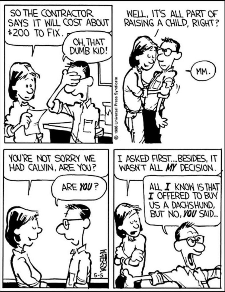 When a home repair bill comes in, Calvin’s parents debate the real cost of raising him—and whether a dachshund would’ve been less trouble. Parenthood: never boring, always expensive.