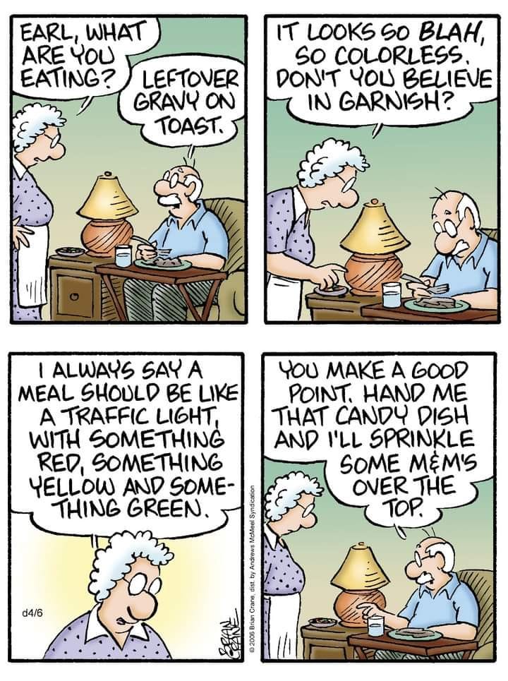 Earl’s dinner might be bland, but his solution (adding M&M’s) is…colorful.
