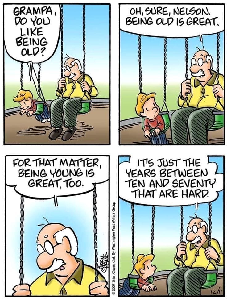 Both youth and age are great; it’s adulthood that’s the real struggle. Preach, Grandpa.