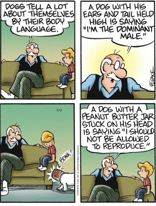 “A dog with a peanut butter jar stuck on his head is saying ‘I should not be allowed to reproduce.’”