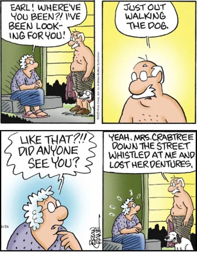 “Mrs. Crabtree down the street whistled at me and lost her dentures.”