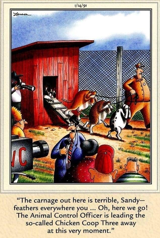 A poultry prison break meets investigative journalism in this chaos-filled scene. As dogs are perp-walked out of a coop under the watchful eye of cameras, feathers and drama fly. Larson turns an animal control moment into an epic crime saga — and it’s hilarious.