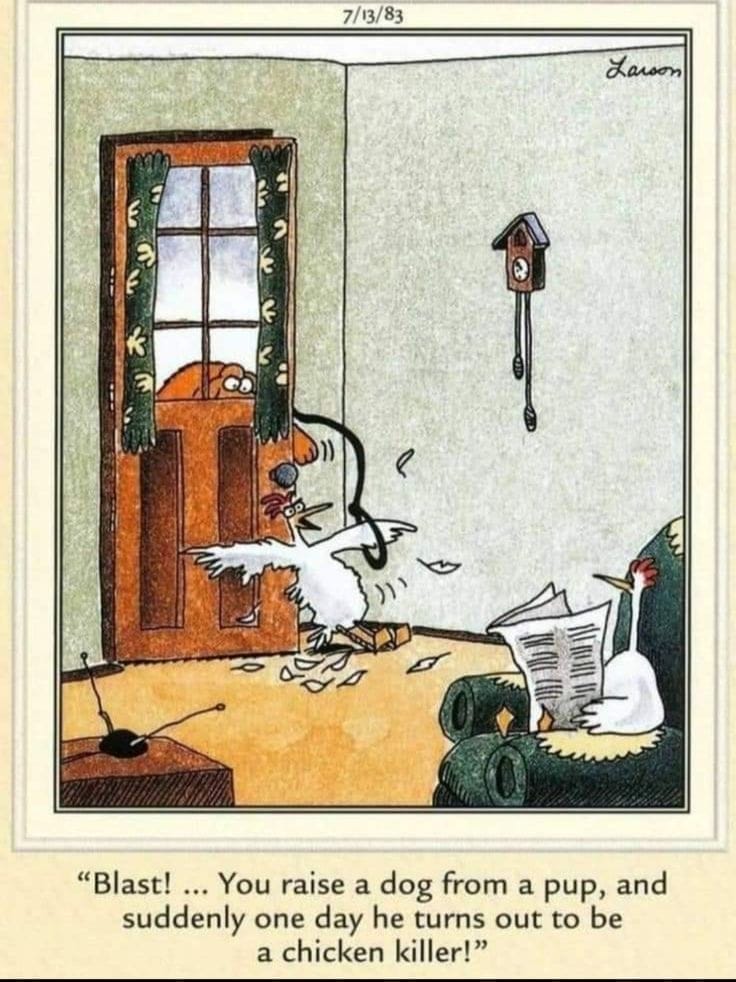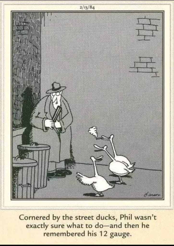 In this darkly hilarious panel, two deer are chatting in the woods. One has a large bullseye on his chest. The other delivers the ultimate line: “Bummer of a birthmark, Hal.” It’s cruel, quick, and perfectly Far Side — no punch pulled, no apology needed.