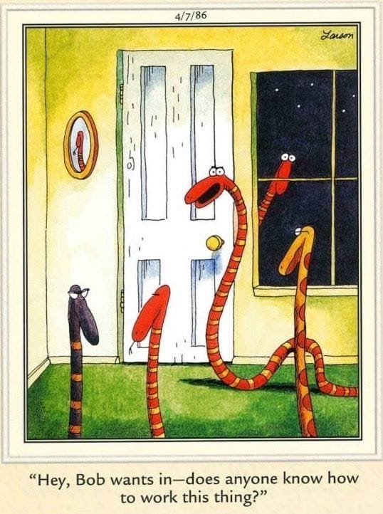 Arguably one of Larson’s most famous cartoons, this one shows a “gifted” student failing to push a door that’s clearly marked “pull.” It’s every smart person’s dumb moment immortalized. The physical comedy here is subtle — but pure gold.