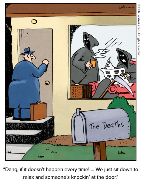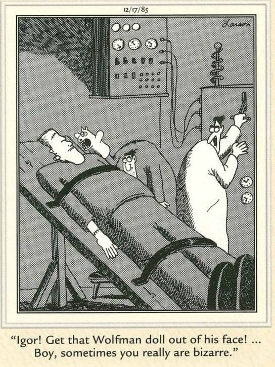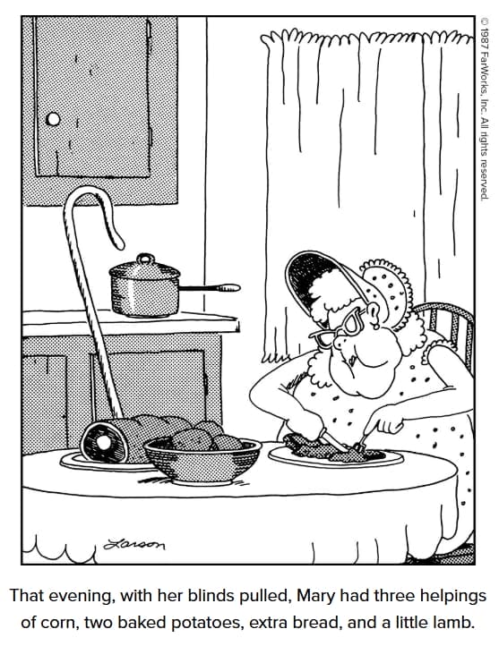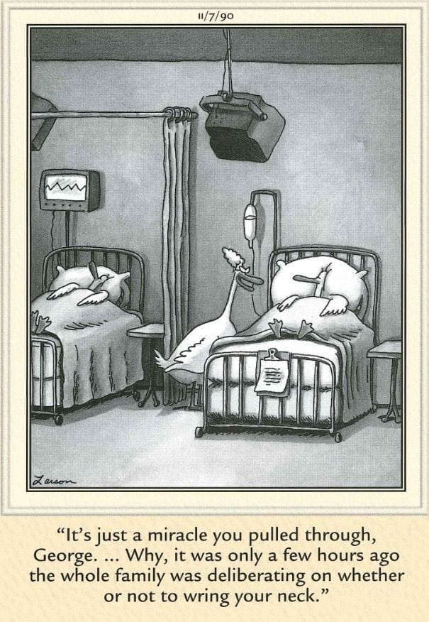 Larson’s take on cosmetic surgery is as bizarre as it is side-splitting. With a buffalo charging through an operating room and a surgeon named Dr. Blumenfeld, we get a surreal vision of what could go wrong in the hands of a mad doc. Let’s just say “buffalo nose” is a side effect you won’t find in your insurance plan.
