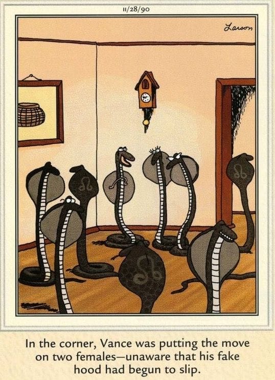 A moose wearing a dress and high heels on a fashion runway? Classic Far Side. The comic absurdly suggests animal modeling is a thing — and that no one in the audience bats an eye. It’s a jab at both haute couture and how far we’ll go for “style.”