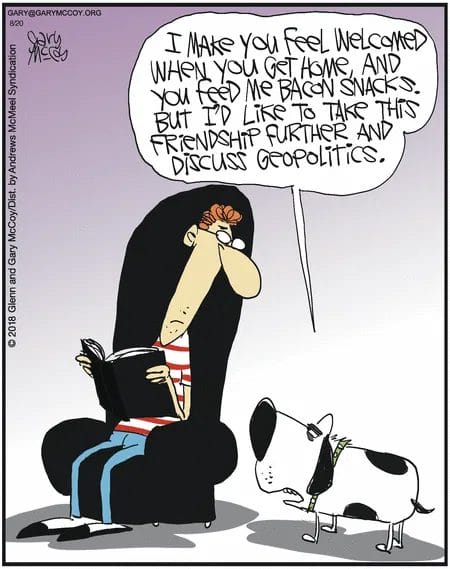 A dog wants to move beyond bacon treats into global issues. If only international summits were this entertaining.
