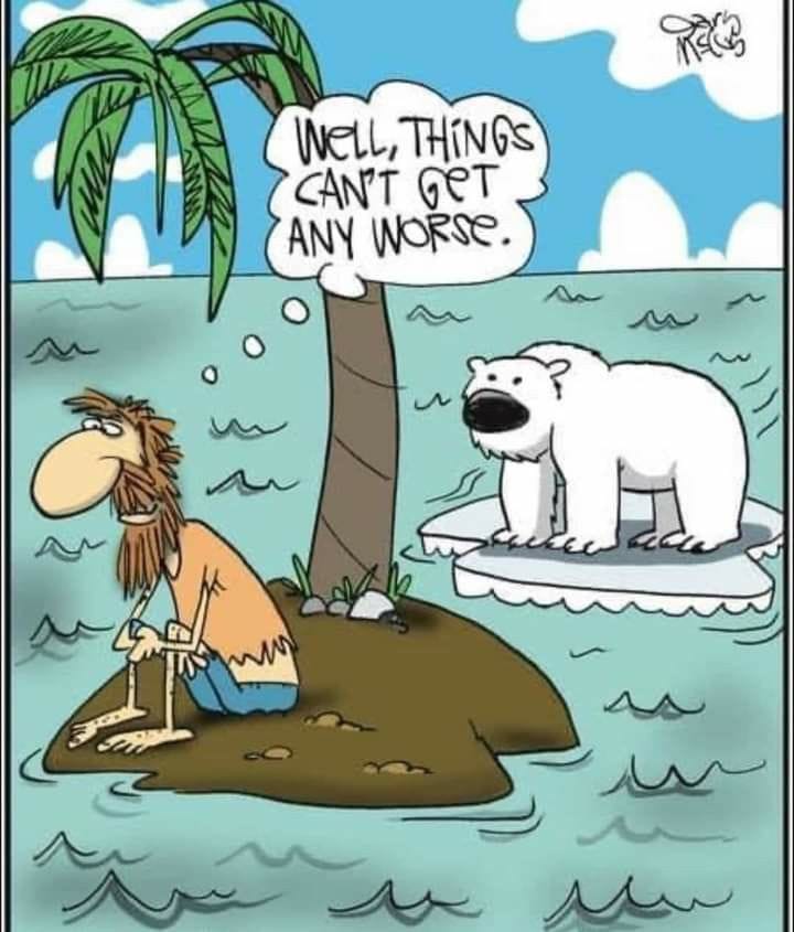 A castaway thinks things can’t get worse—then a polar bear floats in. Perfect example of “famous last words.”