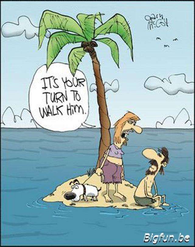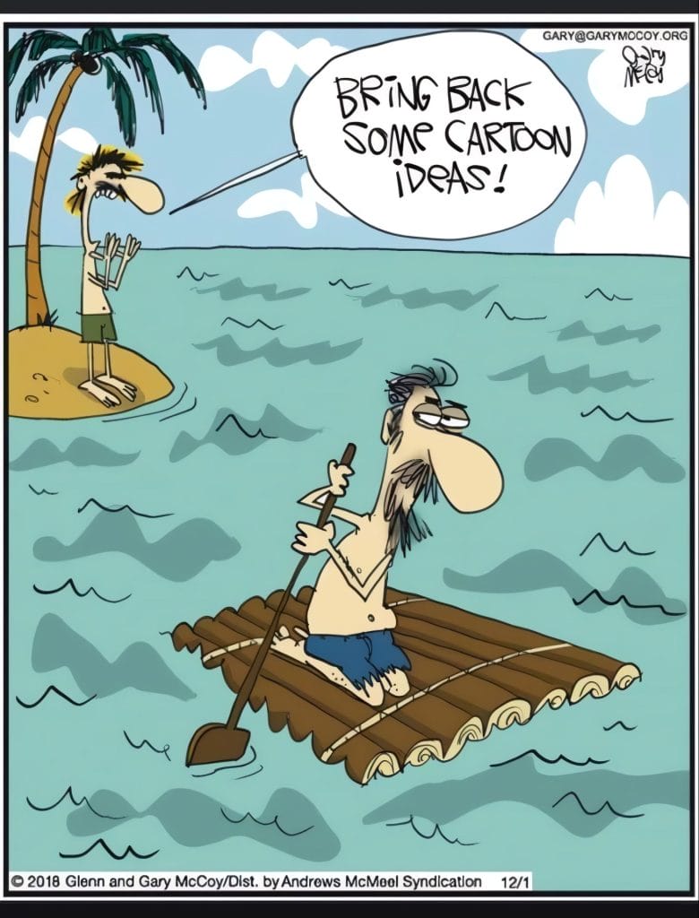 Two island survivors, but one is sent for “cartoon ideas.” A brilliant, self-aware gag about the struggle of creativity.