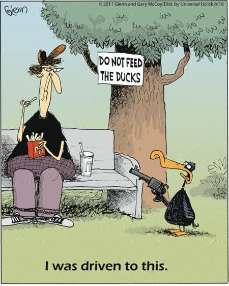 After a “Don’t feed the ducks” sign, one duck arms itself. Savage, surreal, and hilariously unexpected.