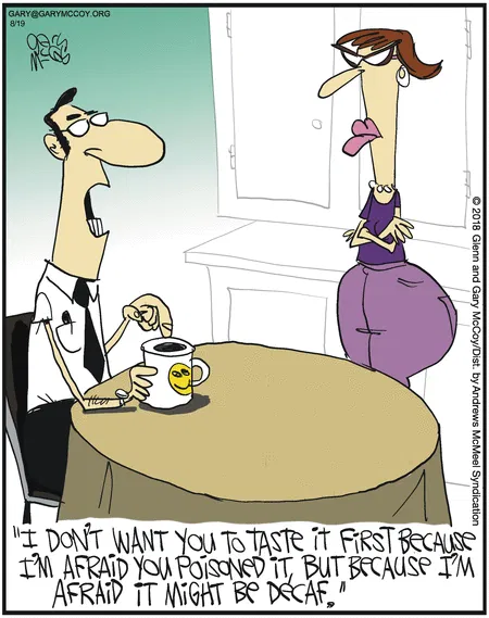 A man nervously explains he’s not worried his wife poisoned his coffee—just that it might be decaf. The truest horror of them all.