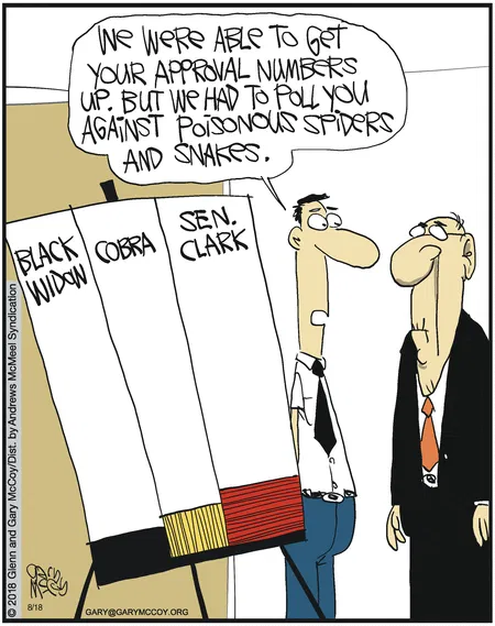 Sen. Clark’s approval rating competes against cobras and black widows… and loses. Political humor doesn’t get sharper than this.