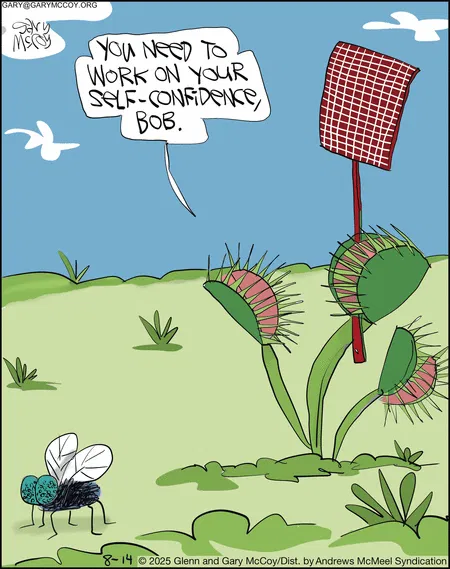 A Venus flytrap gives a pep talk to its prey, while a swatter looms nearby. Dark irony, lighthearted delivery.
