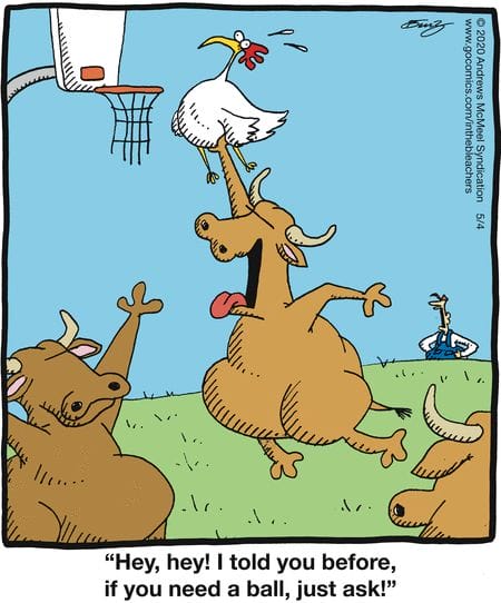 Basketballs and barnyards finally collide. The cows and chickens aren’t playing by the rules, but the result is comic genius.