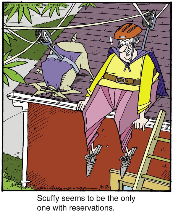 Who says thrill-seeking is just for the young? With helmets on and a zipline to nowhere, only Scuffy seems to understand that gravity is undefeated. This comic proves that neighborhood adventure clubs have…mixed results.