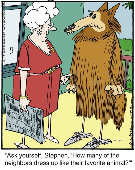It’s dress-up day in suburbia and Stephen may have taken “spirit animal” just a tad too literally. Cue the classic side-eye from the neighbors—and a new low for home fashion trends.
