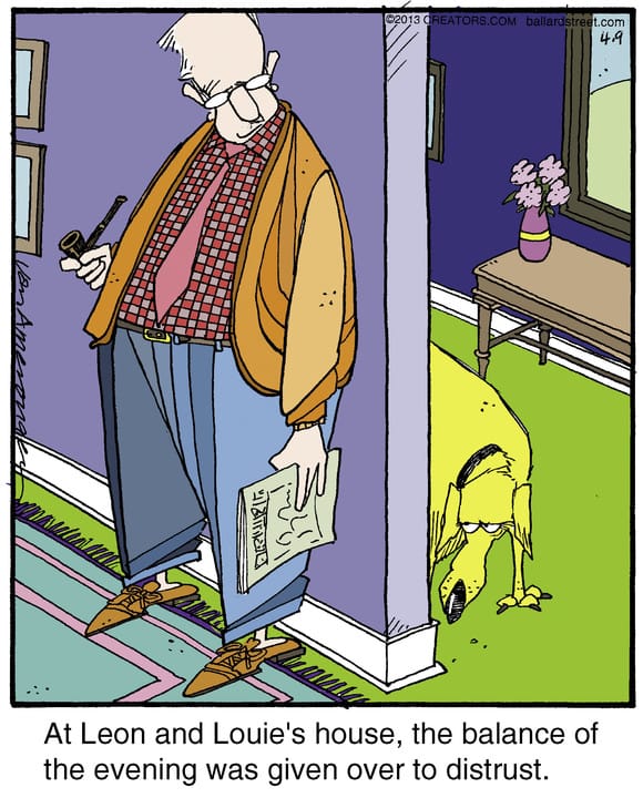 Trust issues aren’t just for humans. This comic captures the tension when even the dog’s got doubts about your motives. Sideways glances and pipe-smoking included.